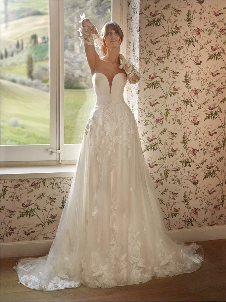 Le se collezioni spaziano dalle linee principesche alle siluette leggere e fluide, realizzate con tessuti pregiati come tulle, mikado, chiffon e organza. Pizzi delicati, ricami luminosi e giochi di trasparenze rendono ogni modello unico e indimenticabile.